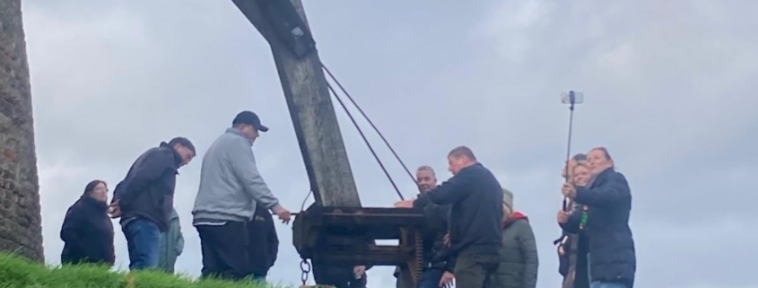 Die Führung wurde von Anton und Georg van Stegen gemacht und führte vom Mühlentunnel bis zur Turmhaube. Die Gruppe zeigte große Begeisterung an der alten Mühlentechnik.